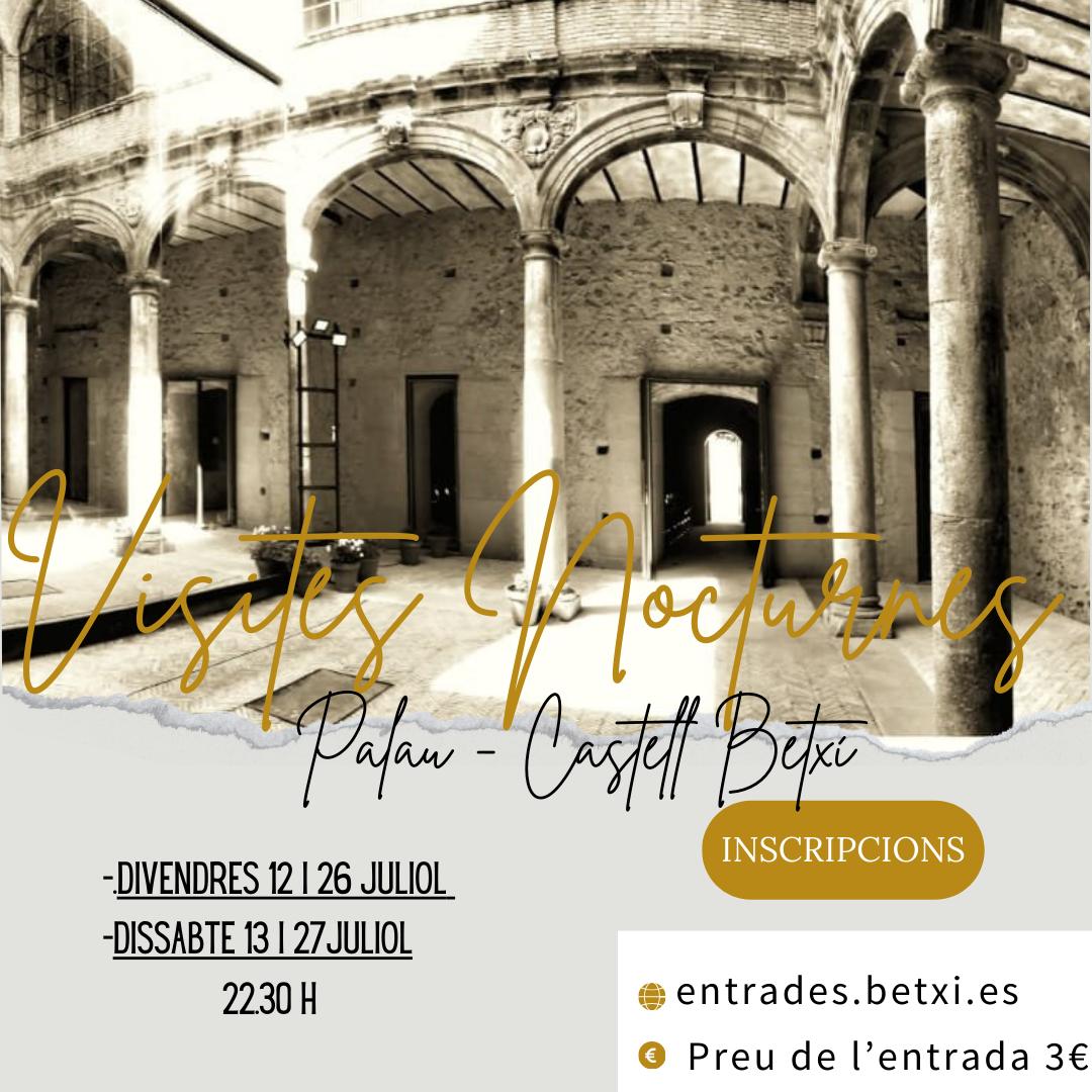 L’Ajuntament de Betxí ha organitzat noves visites guiades al Palau-Castell de la localitat durant els caps de setmana de juliol, amb la novetat que aquesta volta es faran en horari nocturn. D’aquesta manera, aquest dissabte i diumenge 13 i 14 de juliol, així com el 27 i 28 del mateix mes, a les 22:30 hores, es podran redescobrir els seus racons més emblemàtics i importants.