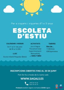 Entre els diferents tallers que desenvoluparan els alumnes, estan previstos jocs d’aigua, manualitats, diferents esports i algunes excursions, entre altres activitats. Les inscripcions estan obertes fins al 20 de juny en la pàgina web de l’empresa organitzadora, www.sagals.es, amb un preu de 110€/mes i 60€ per una quinzena. La inscripció inclou dues samarretes i diverses excursions.