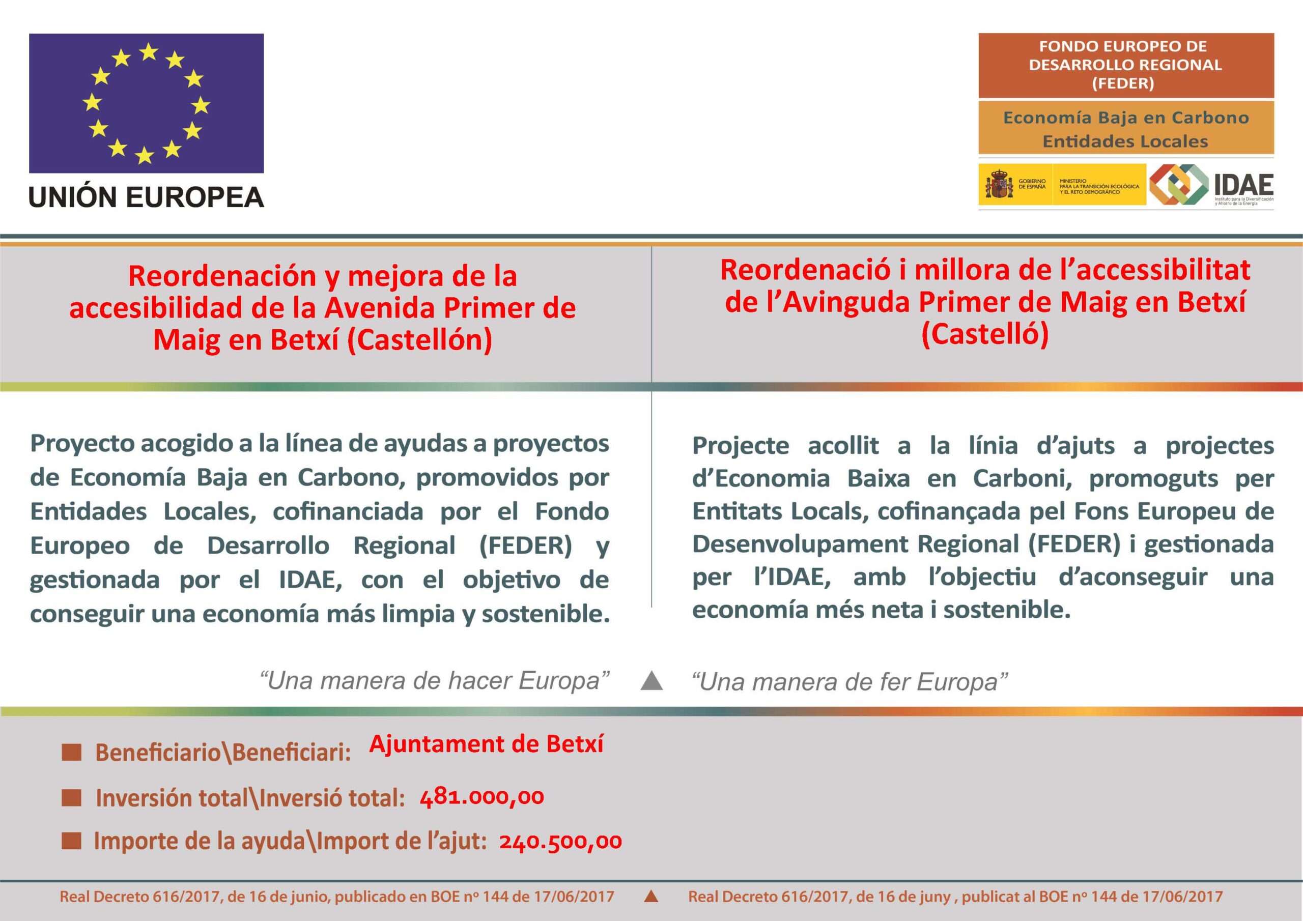 L’Ajuntament de Betxí rebrà 240.000 euros a través dels fons europeus FEDER 2014-2020, en el marc de les subvencions a projectes singulars d’entitats locals que afavorisquen el pas a una economia baixa en carboni, que serviran per a finançar part del projecte de l’Avinguda Primer de Maig que s’ha iniciat recentment.