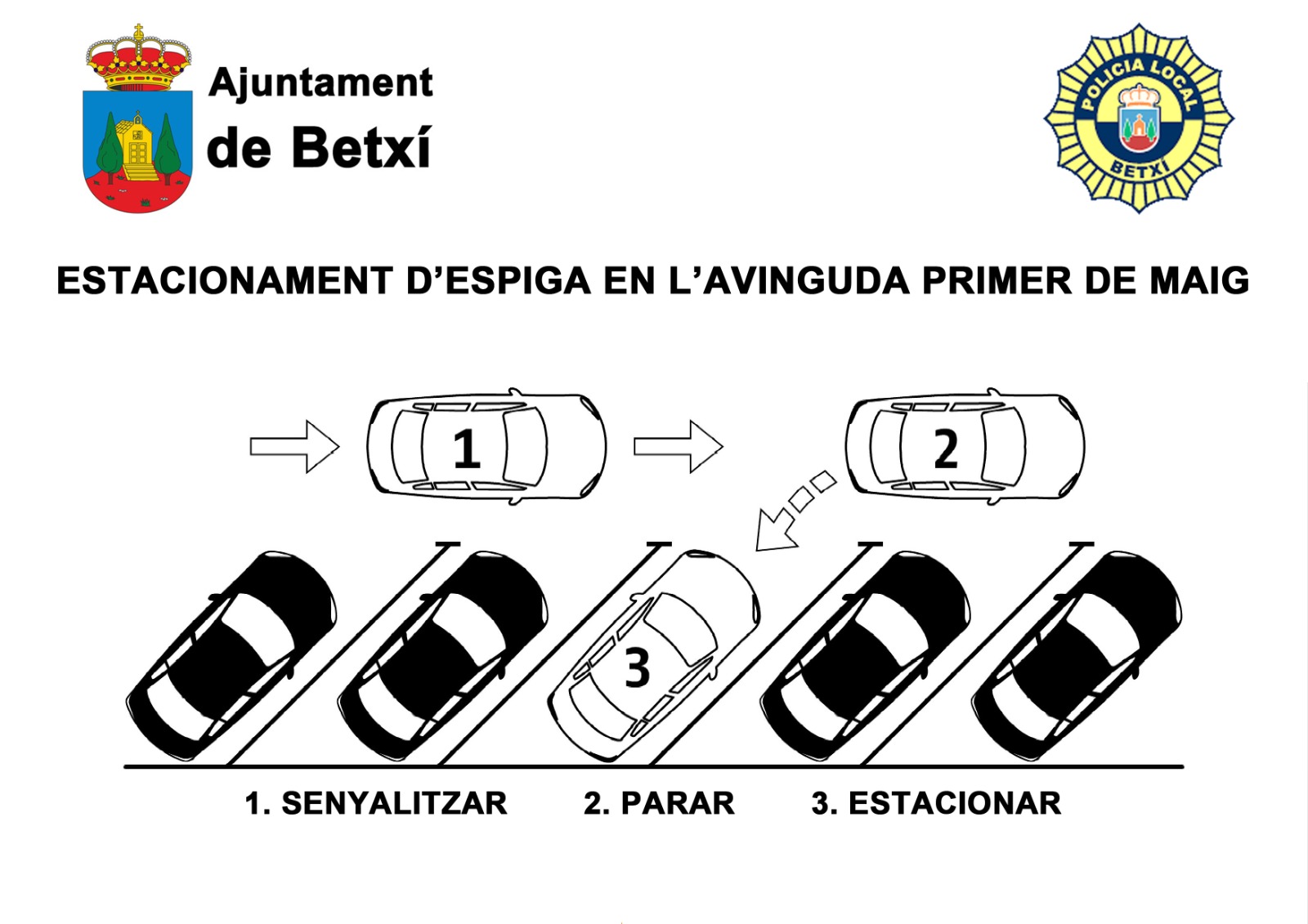 Per recomanació de la Direcció General de Trànsit, i per tal de millorar la seguretat dels vehicles en el moment de la maniobra d’eixida, s’ha canviat el sentit de l’aparcament en bateria per la forma d’espiga invertida.