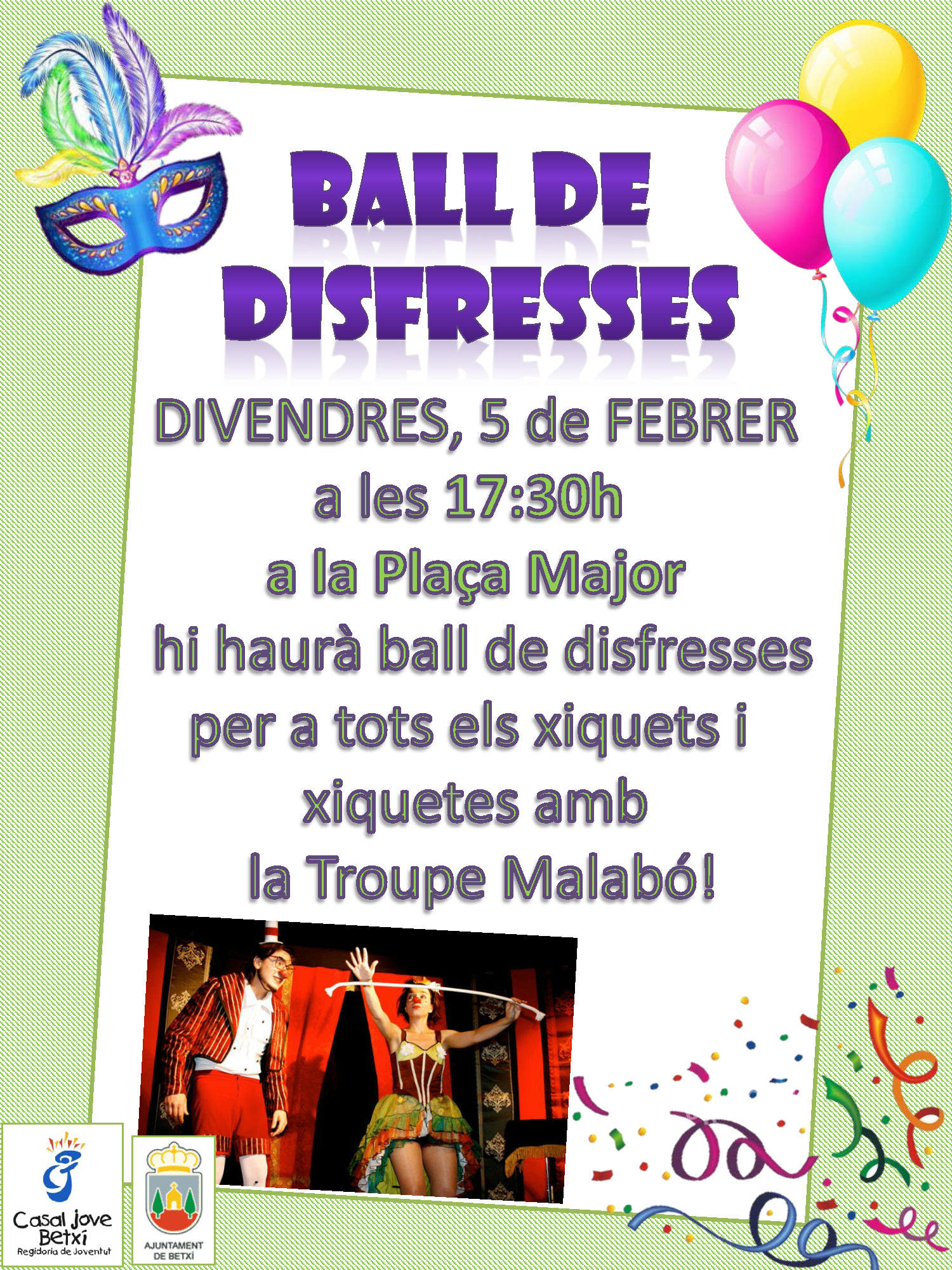 carnestoltes_2016Divendres, 5 de febrer: Carnaval 2016. Ball de disfresses, a la Plaça Major, per a tots els xiquets i xiquetes, amb la Troupe Malabó.