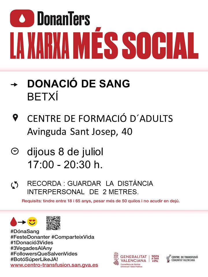 Centre Públic Municipal de Formació de Persones Adultes Av. de Sant Josep Obrer, 40, BetxíRequisits: -Tindre entre 18 i 65 anys. -Pesar més de 50 quilos i no acudir en dejú. Recordeu guardar la distància interpersonal de 2 metres.