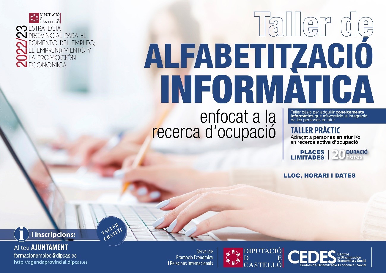 En el mateix sentit, els propers dies 26, 27, 28, 29 i 30 de setembre, de 9:30 a 13:30 h, es durà terme el taller ”Taller alfabetització informàtica per a l’ocupació”. És una actuació destinada a persones desocupades que desitgen millorar les seues competències digitals i adquirir coneixements informàtics bàsics per a afavorir la integració tecnològica per tal de fomentar la inserció laboral a través de l’alfabetització digital.