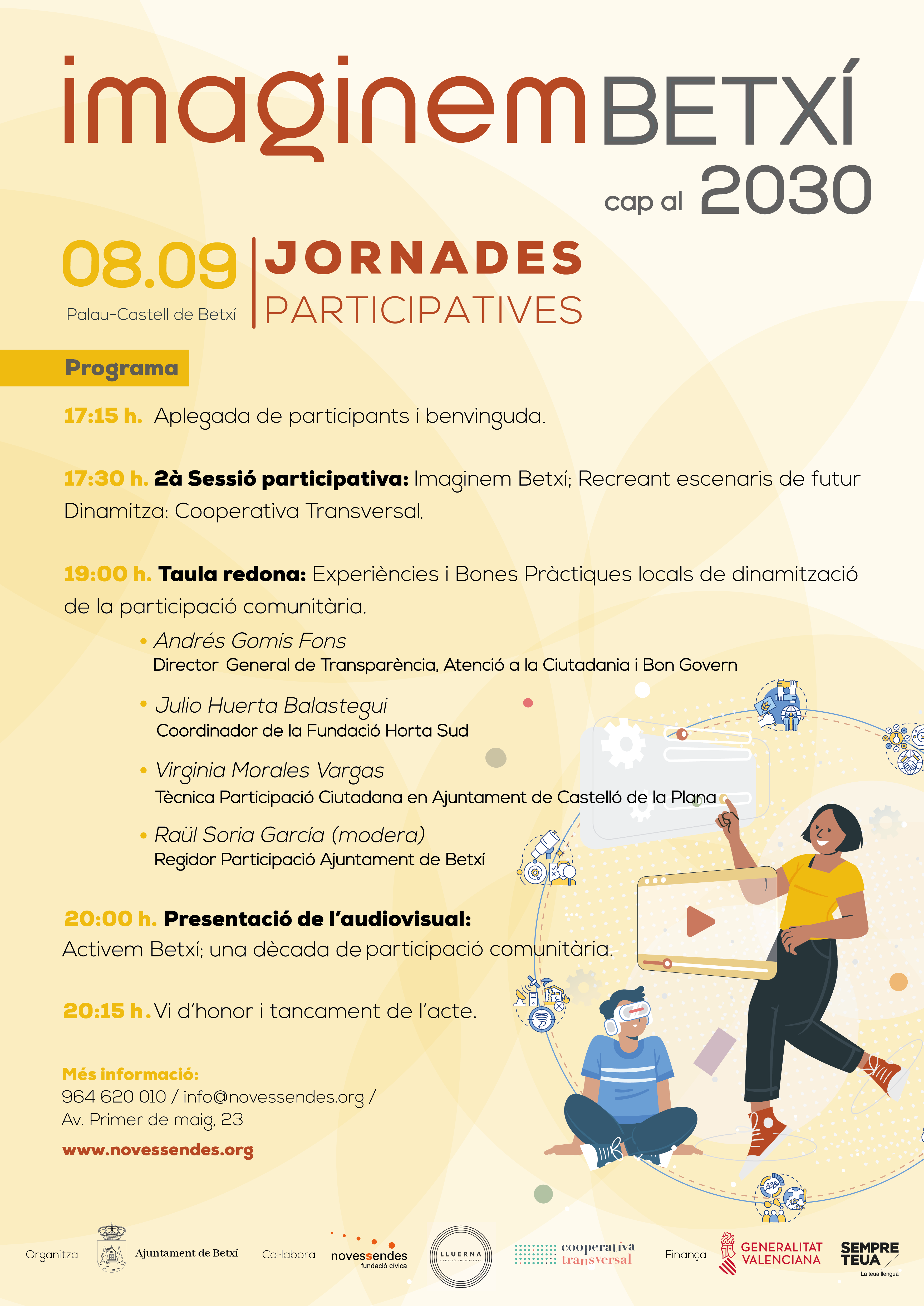La fundació Novessendes, conjuntament amb l’Ajuntament de Betxí, continua celebrant les Jornades Participatives «Imaginem Betxí cap al 2030». La segona sessió tindrà lloc al Palau Castell de Betxí, el proper 8 de setembre.