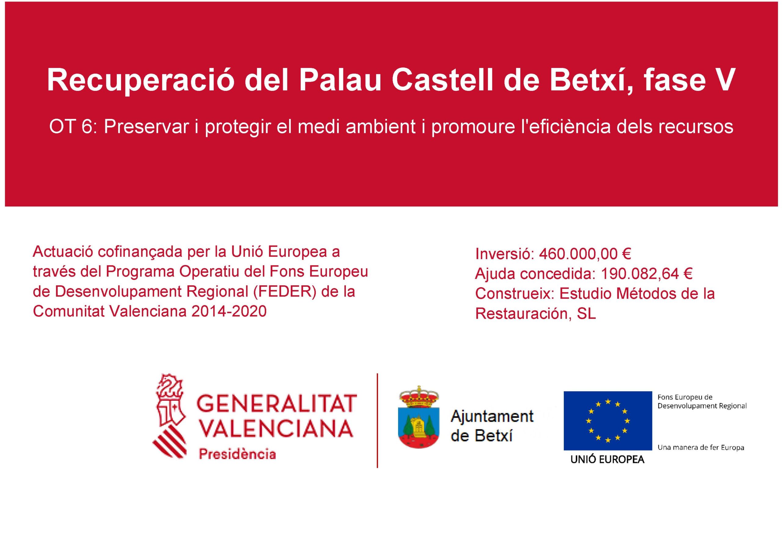 Betxí torna a estar d’enhorabona. I és que al nostre poble arribaran més de 190.000€, segons el document provisional que s’ha publicat per part de la Generalitat Valenciana amb el llistat dels municipis que rebran les ajudes dels fons FEDER de patrimoni. Uns diners que s’invertiran en la cinquena fase de restauració del Palau que des de fa alguns mesos ja està en marxa. D’esta forma, el projecte, que compta amb un pressupost que supera els 460.000€, serà pràcticament finançat en la seua totalitat entre estos fons europeus i la Diputació de Castelló.