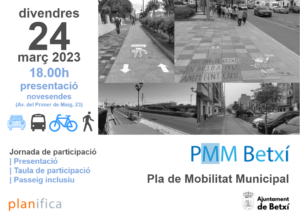 És amb aquesta intenció que l’Ajuntament de Betxí, amb la col·laboració de l’equip redactor del Pla de Mobilitat Municipal, ha organitzat un acte de presentació del Pla que tindrà lloc el proper divendres 24 de març, a les 18.00 hores, en la seu de la Fundació Novessendes. L’acte inclourà una taula de participació i un passeig inclusiu.