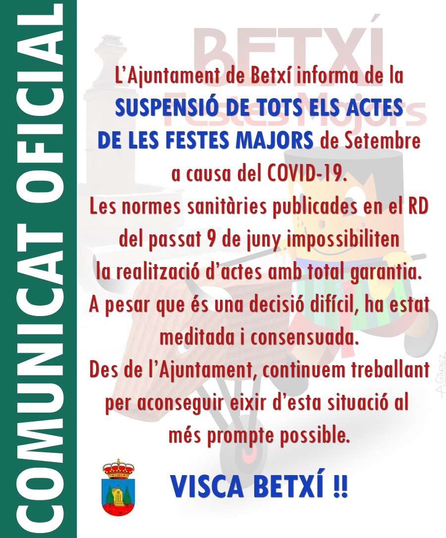 L’Ajuntament de Betxí ha adoptat la decisió de suspendre les Festes Majors de Setembre 2020, en honor al Santíssim Crist de la Pietat, a causa de la pandèmia de la COVID-19. Les mesures dictades pel Reial Decret 21/2020, de 9 de juny, en matèria de prevenció, contenció i coordinació per fer front a la crisi sanitària així ho aconsellen.