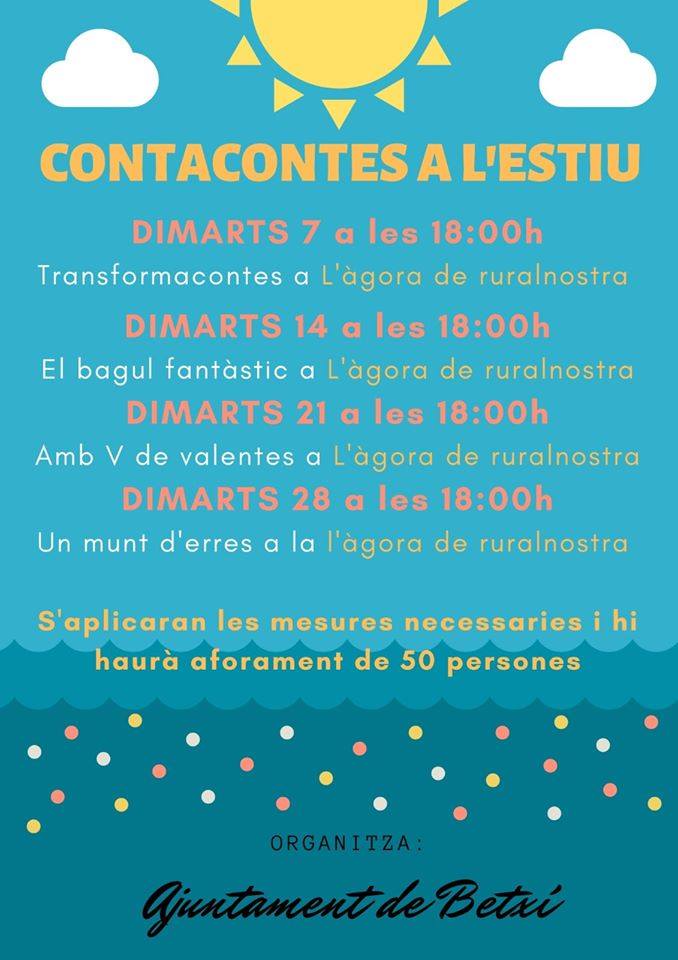 L’Ajuntament de Betxí inicia la programació cultural de l’estiu amb contacontes per als més menuts durant tots els dimarts del mes de juliol. Els tallers, que seran conduïts per Rosabel Contaclown, es desenvoluparan a l’Àgora amb estrictes mesures de seguretat i higiene i un aforament limitat a 50 persones.