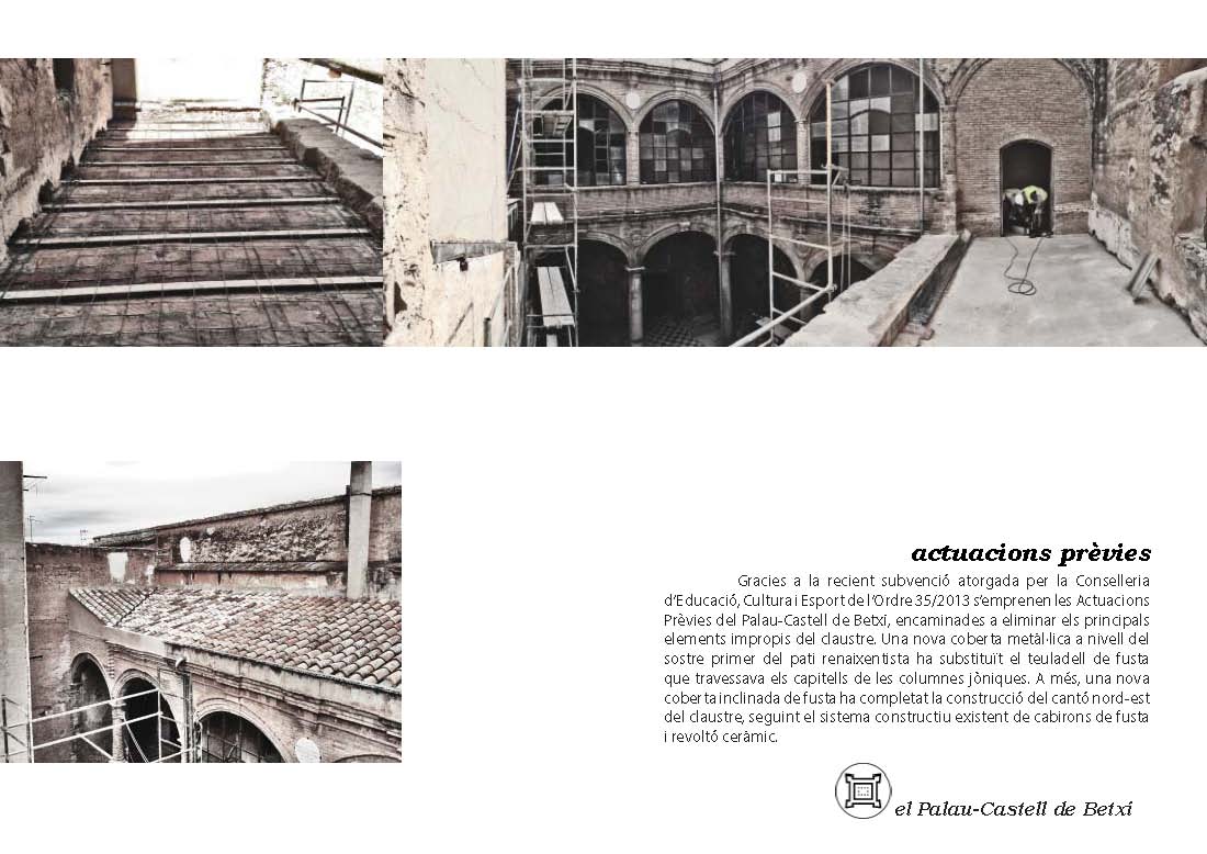 Gràcies a la subvenció atorgada per la Conselleria d‘Educació, Cultura i Esport en 2013, es va emprendre les Actuacions Prèvies del Palau-Castell de Betxí, encaminades a eliminar els principals elements impropis del claustre. Una nova coberta metàl·lica a nivell del sostre primer del pati renaixentista ha substituït el teuladell de fusta que travessava els capitells de les columnes jòniques. A més, una nova coberta inclinada de fusta ha completat la construcció del cantó nord-est del claustre, seguint el sistema constructiu existent de cabirons de fusta i revoltó ceràmic.